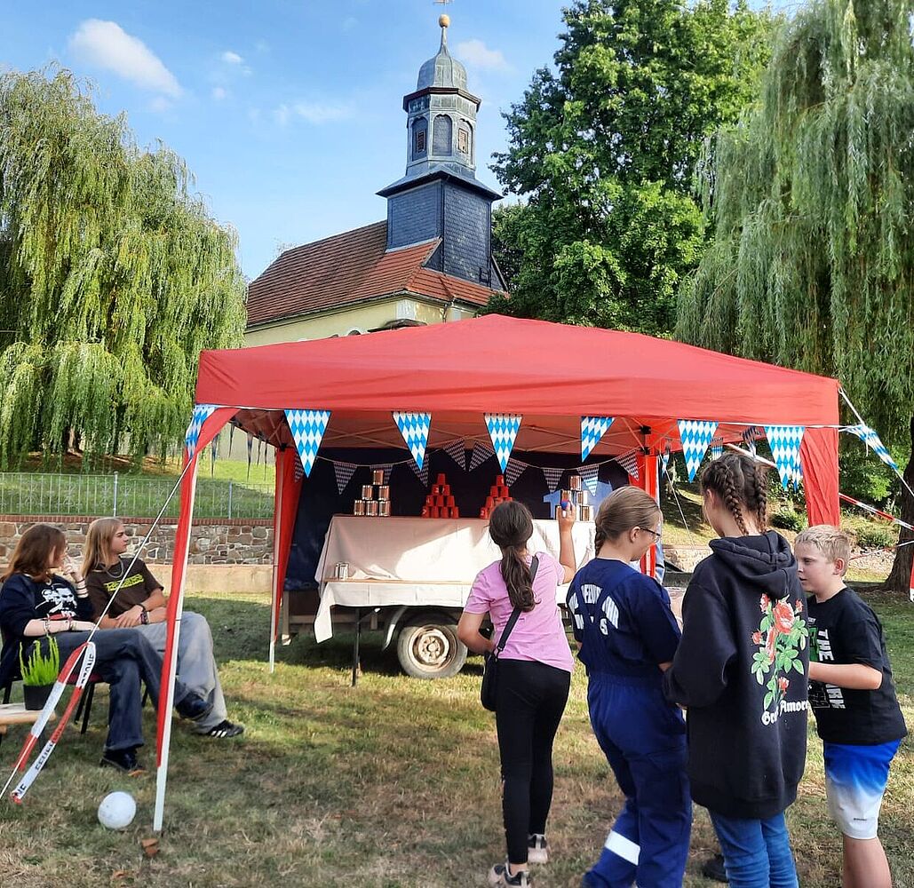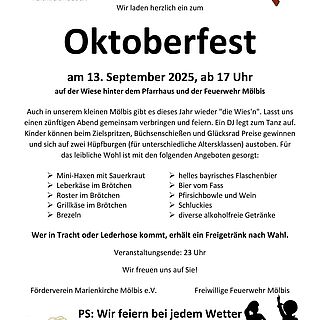Am 13. September 2025 wurde die Wiese hinter dem Pfarrhaus wieder zur "Wies'n". Gemeinsam mit der Feuerwehr Mölbis luden wir zum Oktoberfest mit allem Drum und Dran: Es gab Bier vom Fass und bayerisches Helles, Hax'n mit Sauerkraut, Leberkäse, Roster, Brezeln und vieles mehr. Während die Kinder offensichtlich viel Spaß hatten auf zwei Hüpfburgen (für unterschiedliche Altersklassen), beim Zielspritzen und Büchsenwerfen, genossen die Großen entspannt die letzten Sonnenstrahlen, die leckeren und zünftigen Speisen und Getränke, nette Gespräche und die gute Stimmung. Der DJ legte einen perfekten Mix auf, sodass fleißig getanzt und mitgesungen wurde. Besonders toll fanden wir, dass die überwiegende Mehrheit der Gäste in Tracht bzw. Leserhose kam - das war toll anzuschauen!