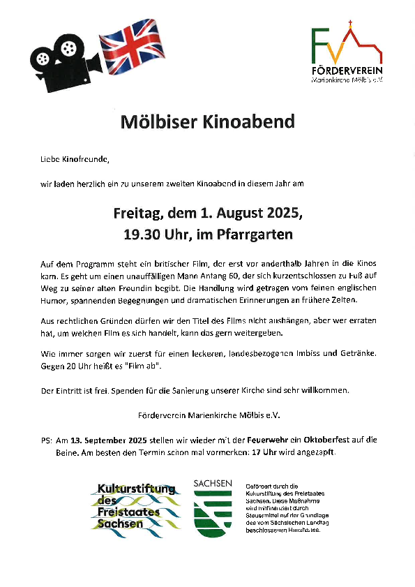Am 1. August 2025 luden wir zu unserem zweiten Filmabend ein: Die unwahrscheinliche Pilgerreise des Harold Fry - ein zum Nachdenken anregender britischer Film. Wie immer gab es vorher einen landestypisch passenden Imbiss und Getränke, und diese Zeit wurde für Gespräche ausgiebig genutzt. Ein schöner gemeinsamer Sommerabend!