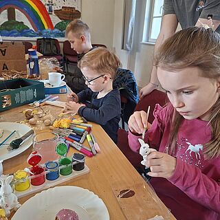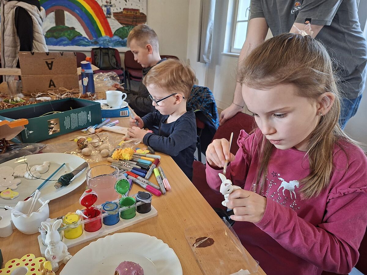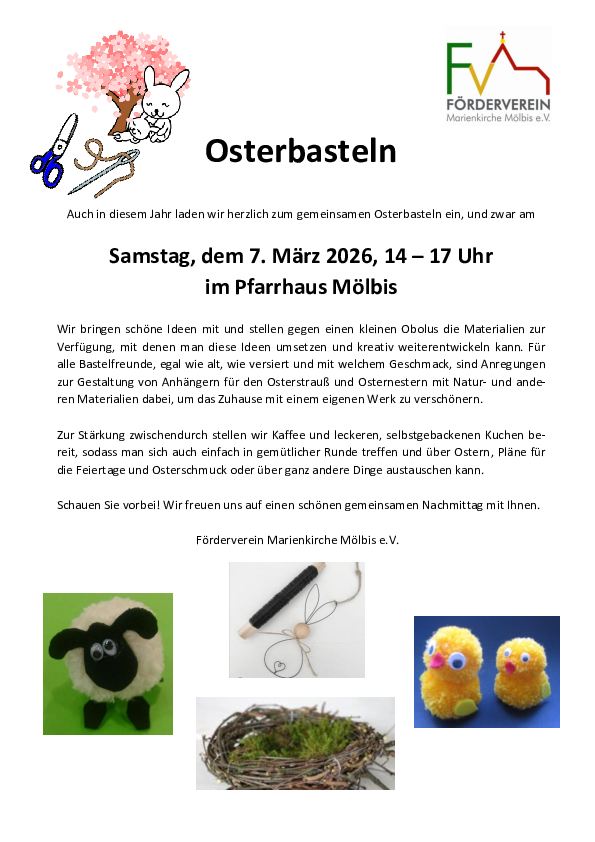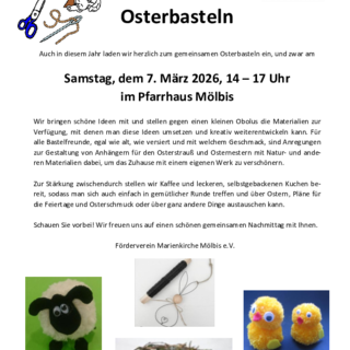 Am 7. März 2026 luden wir zum Osterbasteln ins Pfarrhaus ein. Wir hatten hübsche Ideen und die Materialien zur Umsetzung mitgebracht: Osternester aus Weide und Moos, hübsche Anhänger für den Frühlingsstrauß und kuschelige Wollfiguren. Große und kleine Bastelfreunde waren mit Eifer und viel Freude bei der Sache. Zur Stärkung gab es zwischendurch Getränke und selbstgebackenen Kuchen.