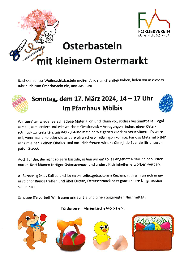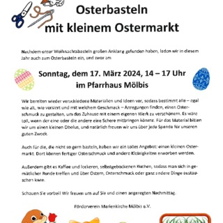Am Sonntag, dem 17. März 2024, stand Ostern im Mittelpunkt: Wir hatten viele unterschiedliche Materialien vorbereitet, aus denen sich man sich mit etwas Geschick und viel Freude am Gestalten einen Osterschmuck basteln und gegen einen kleinen Material-Obulus mit nach Hause nehmen konnte. Die Angebote wurden von Groß und Klein rege angenommen. Wer wollte, konnte bereits fertigen Osterschmuck und andere Kleinigkeiten kaufen. Natürlich war mit Kaffee und Kuchen auch für das leibliche Wohl gesorgt.