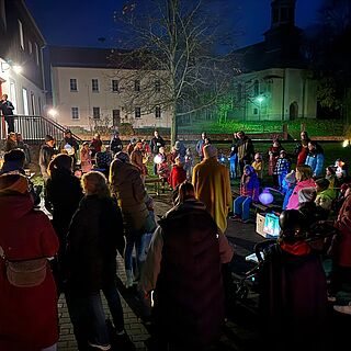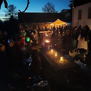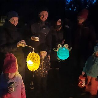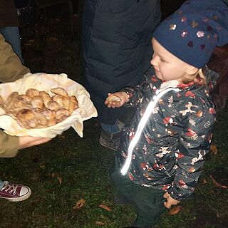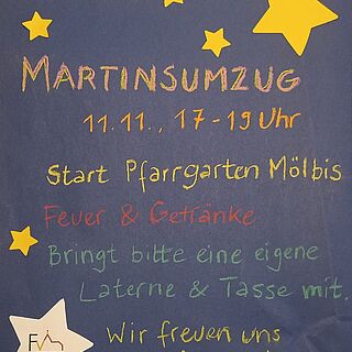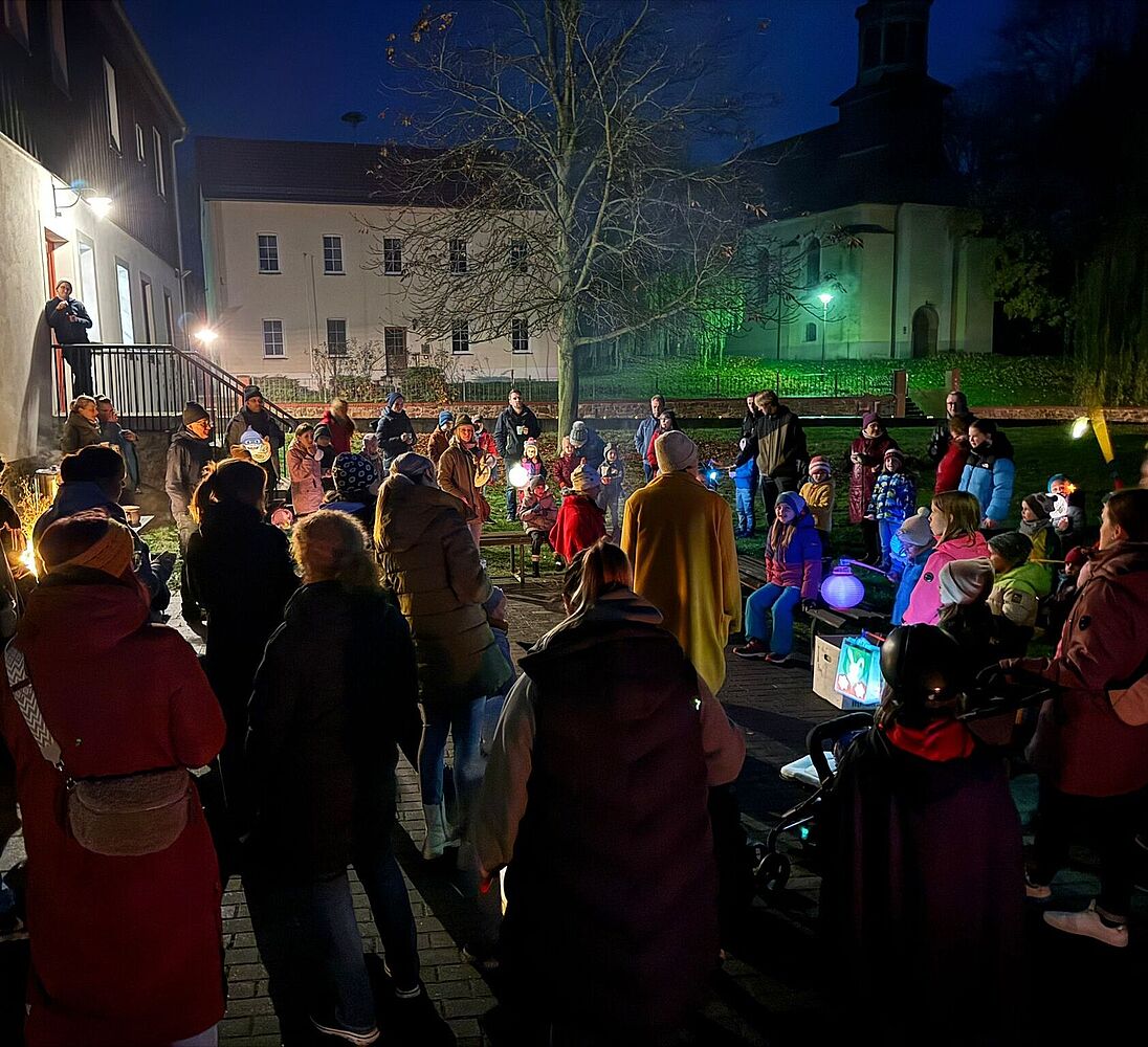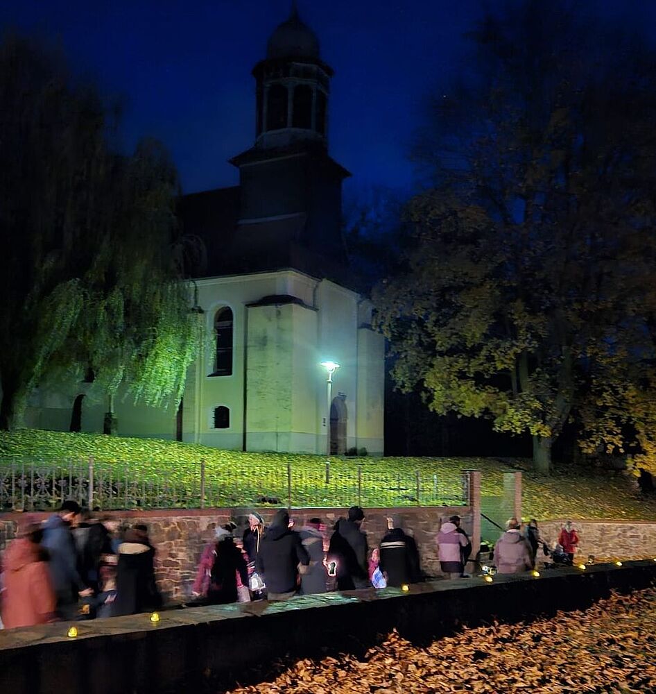 Auch in diesem Jahr gab es in unserem Dörfchen einen Martinsumzug, am 11.11. natürlich. Mit hereinbrechender Dunkelheit kamen viele Große und Kleine mit ihren Lichtern in den Pfarrgarten. Theresa erzählte die Geschichte vom heiligen Martin. Gleich darauf hatten die Kinder die Gelegenheit, das Teilen selbst zu üben - mit leckeren Martinshörnchen, die eifrige Mitglieder des Fördervereins gebacken hatten. Dann trugen alle, vom Pony angeführt, ihr Licht durch Mölbis. Mit Früchtepunsch, Glühwein, Grillwürstchen und vielen Gesprächen klang der schöne Abend aus.