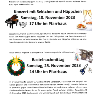 Am Samstag, dem 9. September 2023, fand im Pfarrgarten bei herrlichstem Wetter unser erstes Herbstfest statt. Für das leibliche Wohl gab es Leckeres vom Grill mit und ohne Fleisch, Poffertjes und Knüppelkuchen sowie diverse Getränke. Auf der Tombola für Groß und Klein war mit jedem Los eine kleine Überraschung zu gewinnen, und am Bastelstand konnten mit etwas Kreativität und Geschick Kerzen für die kommende Jahreszeit gestaltet werden. Dazu improvisierte Ricardo auf dem Klavier. Als die Sonne etwas tiefer stand, spielten wir die Filme von der Mölbiser 750- und 775-Jahresfeiern ab. Das war ein sehr schöner gemeinsamer Ausklang der warmen Jahreszeit!