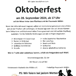 Am Samstag, dem 28. September 2024, organisierten wir zusammen mit der Feuerwehr Mölbis ein zünftiges Oktoberfest - mit allem Drum und Dran! Es gab Bier vom Fass und bayerisches Helles, Haxen mit Sauerkraut, Leberkäse, Roster, Brezeln und vieles mehr. DJ Roland sorgte für die passende Musik, und auch die Kinder hatten auf der Hüpfburg, beim Zielspritzen und beim Büchsenwerfen ihren Spaß.