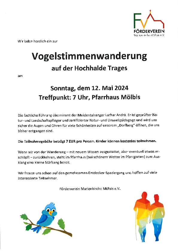 Am Sonntag, dem 12. Mai 2024, führte uns der Muldental-Ranger Lothar Andrä über die Hochhalde Trages und erklärte uns dabei, welches Zwitschern welcher Vogelart zuzuordnen ist. 25 verschiedene Gesänge haben wir gelernt und zahlreiche interessante Informationen erhalten. Nach der Wanderung stand im Pfarrgarten ein leckeres Frühstück bereit, bei dem wir noch das eine und andere Thema vertiefen konnten. Ein herrlicher Sonntagvormittag!