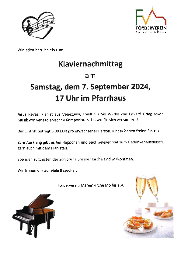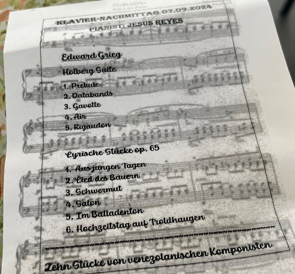Am Samstag, dem 7. September 2024, fand unser zweiter Klaviernachmittag mit Jesús Reyes statt. Auf dem Programm standen Werke von Edvard Grieg und Musik von venezolanischen Komponisten - bekannte und neue Klänge also, und in jedem Fall wunderschöne Musik.